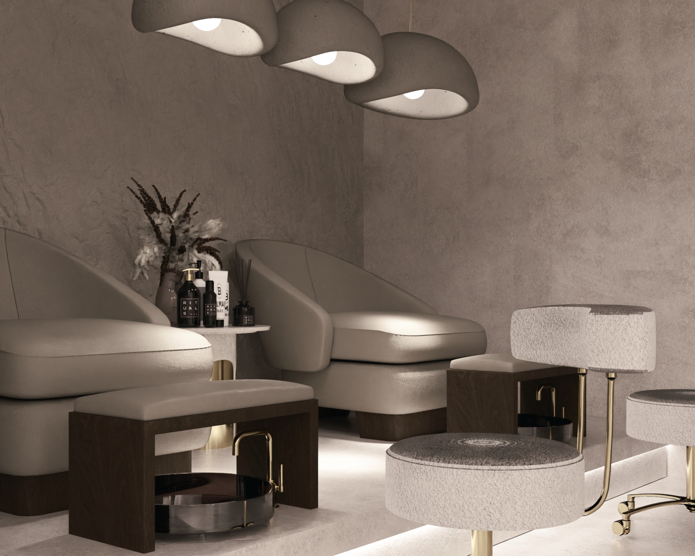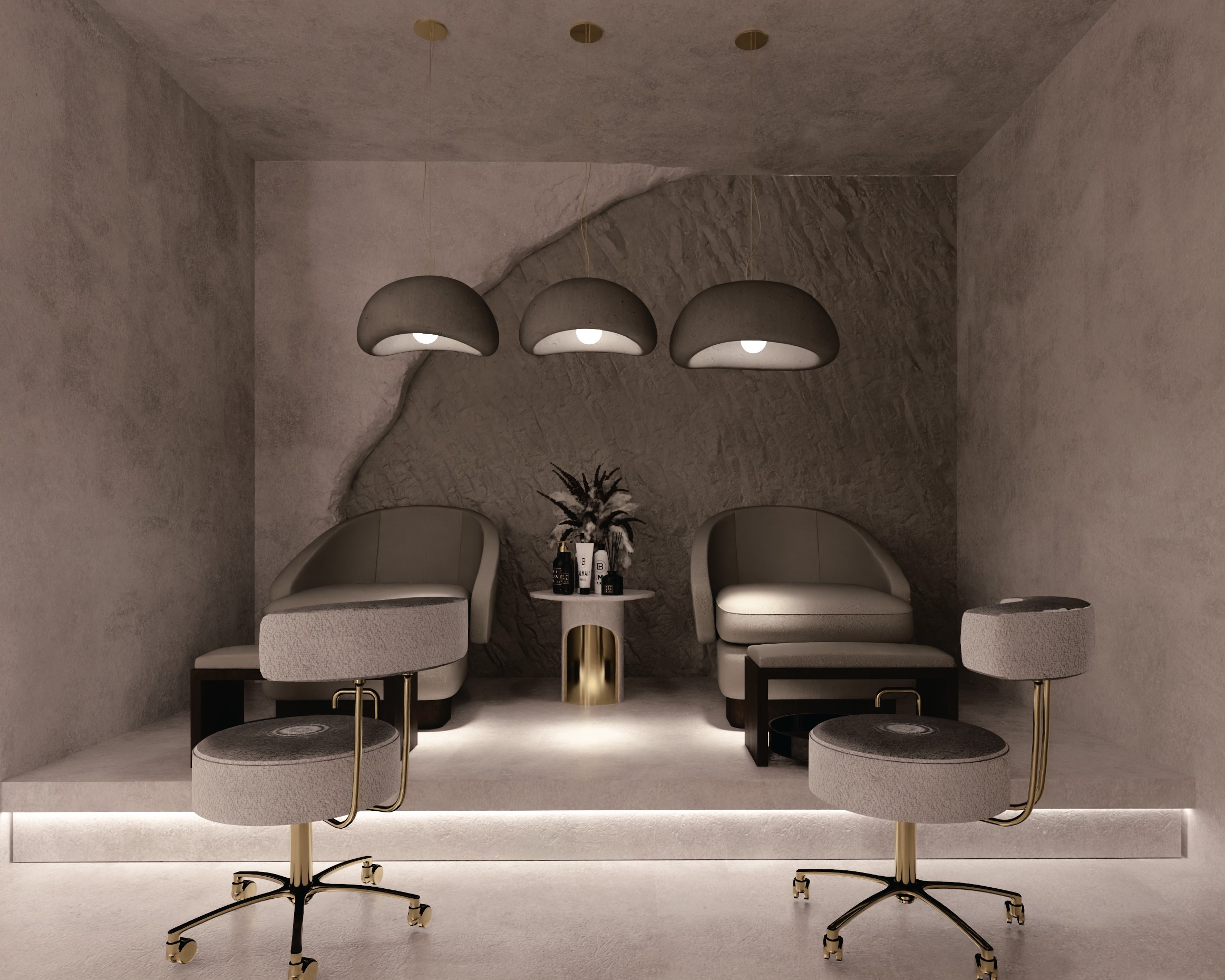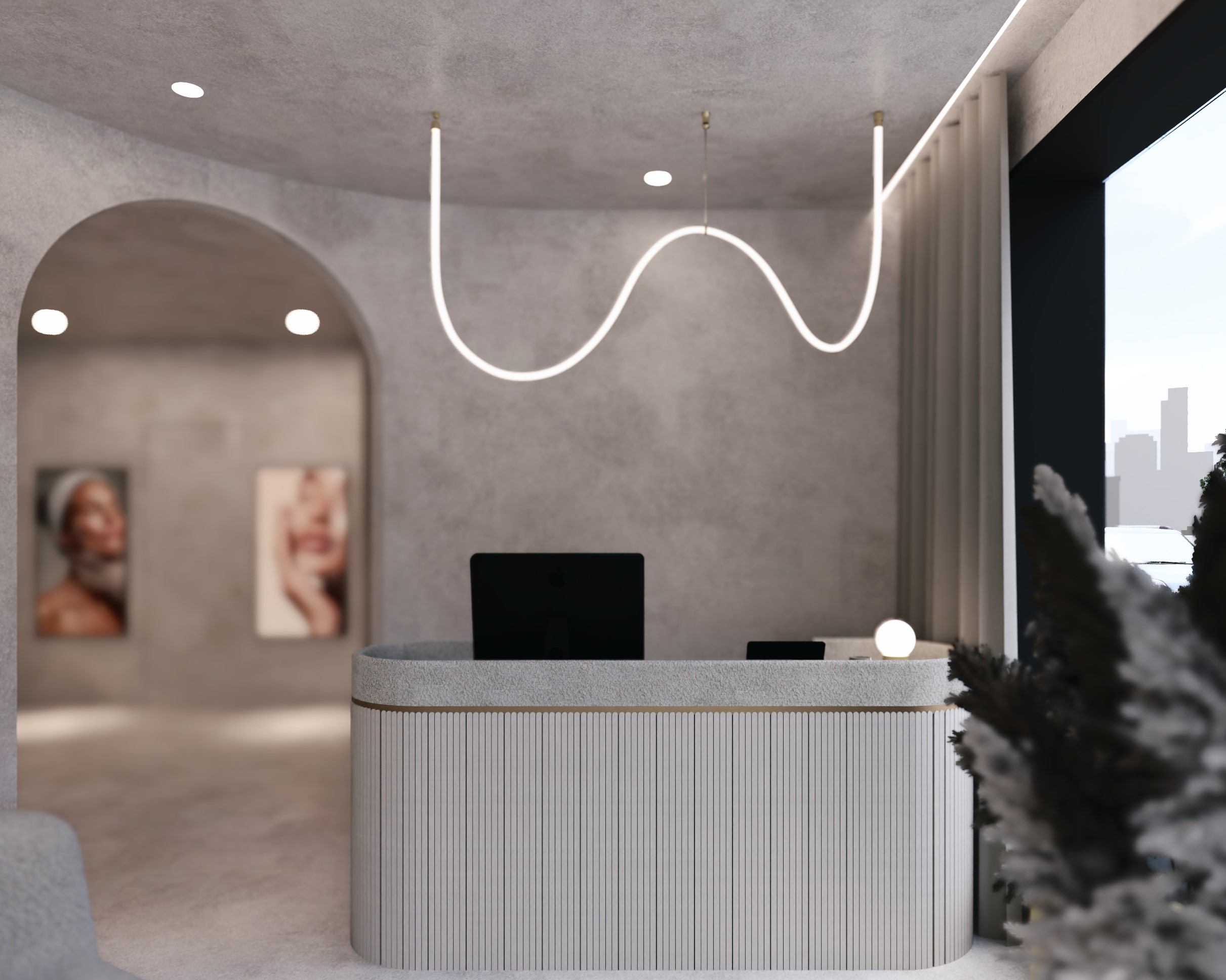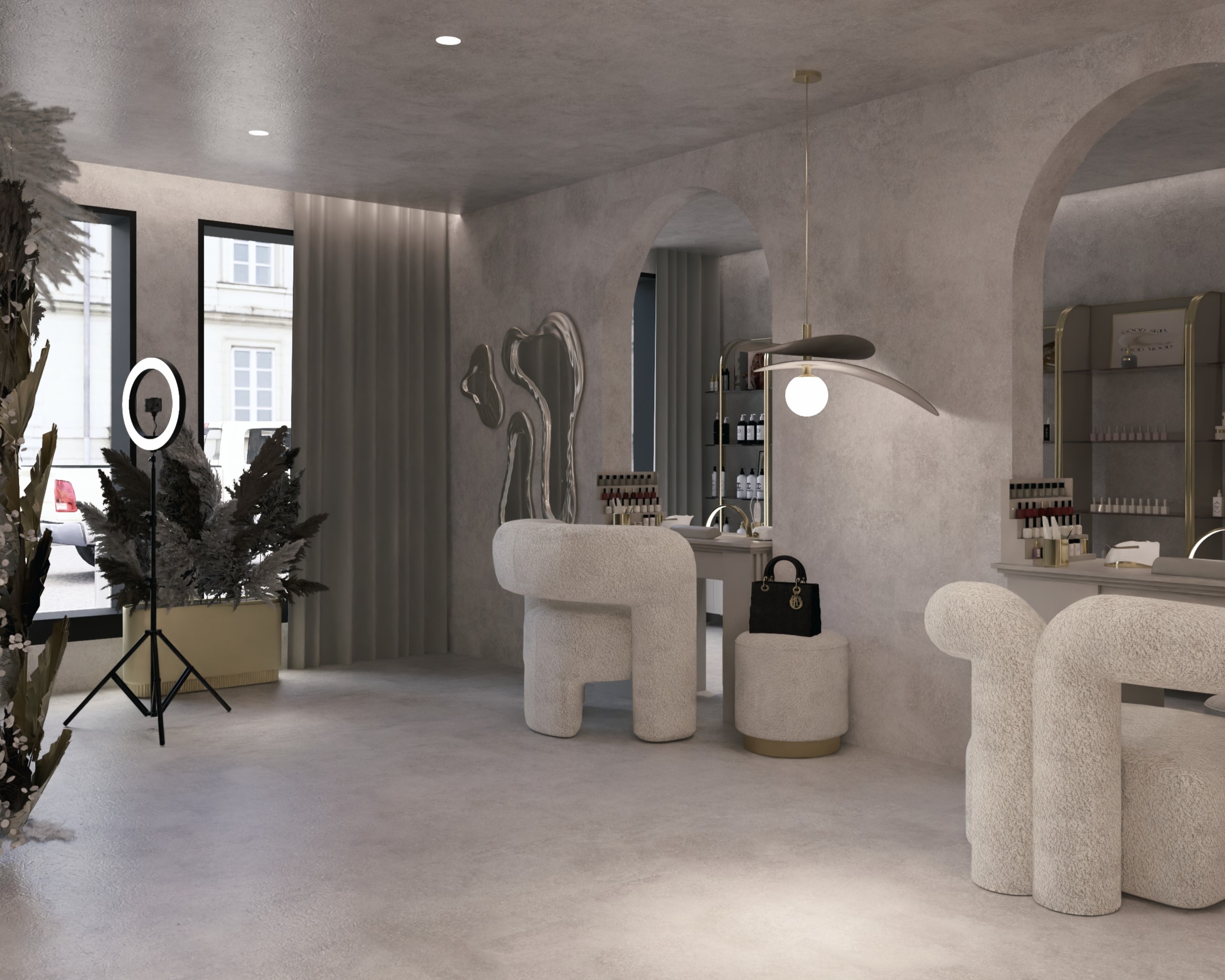 Projekt ten to autorska wizja nowoczesnego wnętrza komercyjnego z branży beauty, zaprojektowana jako zmysłowa oaza spokoju. Przestrzeń została w całości otulona strukturalnym tynkiem o surowej, kamiennej fakturze, co tworzy spójne i minimalistyczne tło. Ta pozorna surowość jest jednak perfekcyjnie zbalansowana przez organiczną architekturę – wszechobecne łuki, płynne linie oraz niezwykle miękkie, zaoblone meble wykończone przyjemną w dotyku tkaniną bouclé.