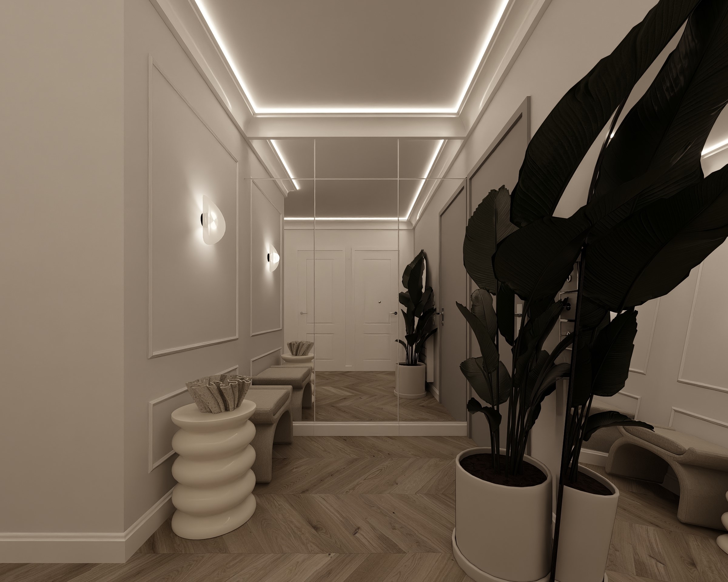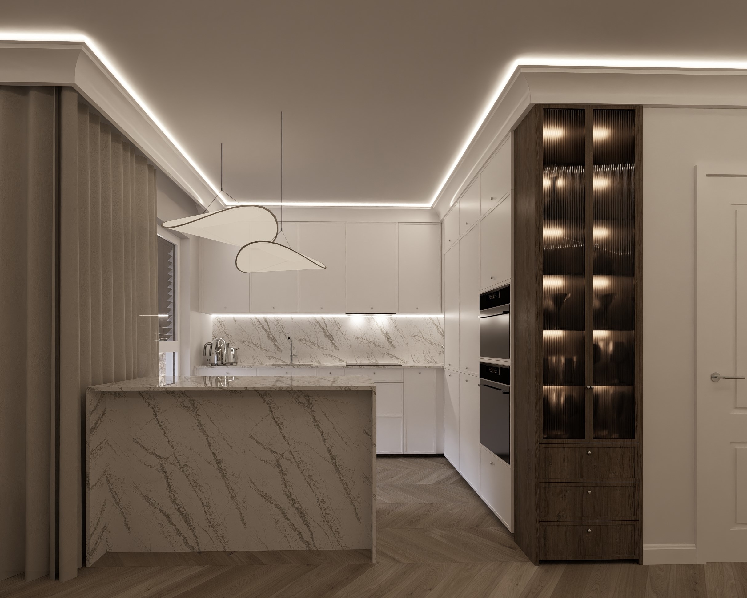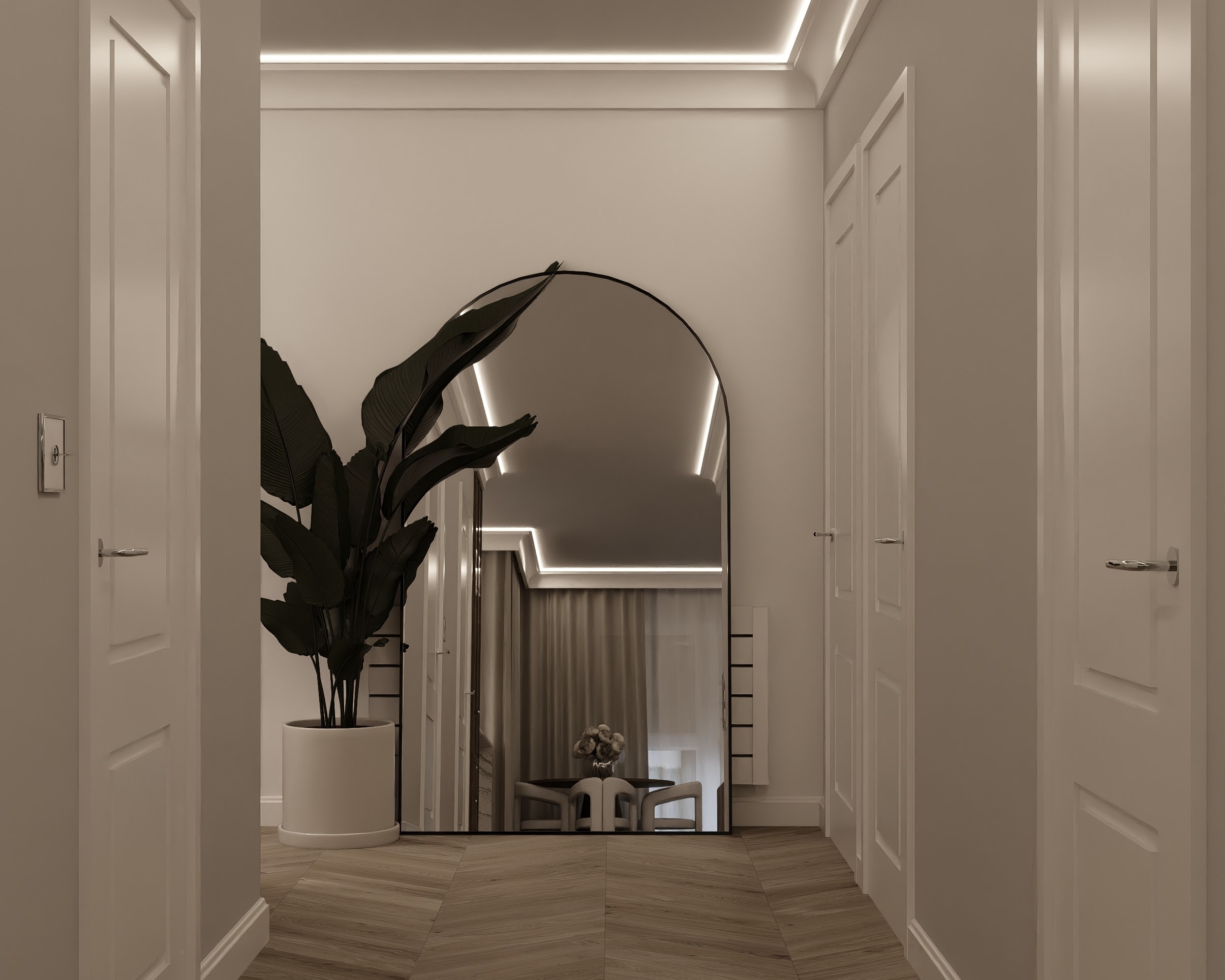 Projekt ten to kwintesencja stylu modern classic, w którym ponadczasowa tradycja harmonijnie spotyka się z nowoczesnym designem. Architektoniczna baza wnętrza, oparta na klasycznym parkiecie ułożonym w jodłę francuską oraz subtelnej sztukaterii ściennej, została skąpana w jasnej, śmietankowej palecie barw. Przestrzeń zyskuje wyjątkową głębię dzięki precyzyjnie zaplanowanemu oświetleniu liniowemu, które poprowadzono wzdłuż listew sufitowych, co optycznie podwyższa wnętrze i nadaje mu niezwykłej lekkości.